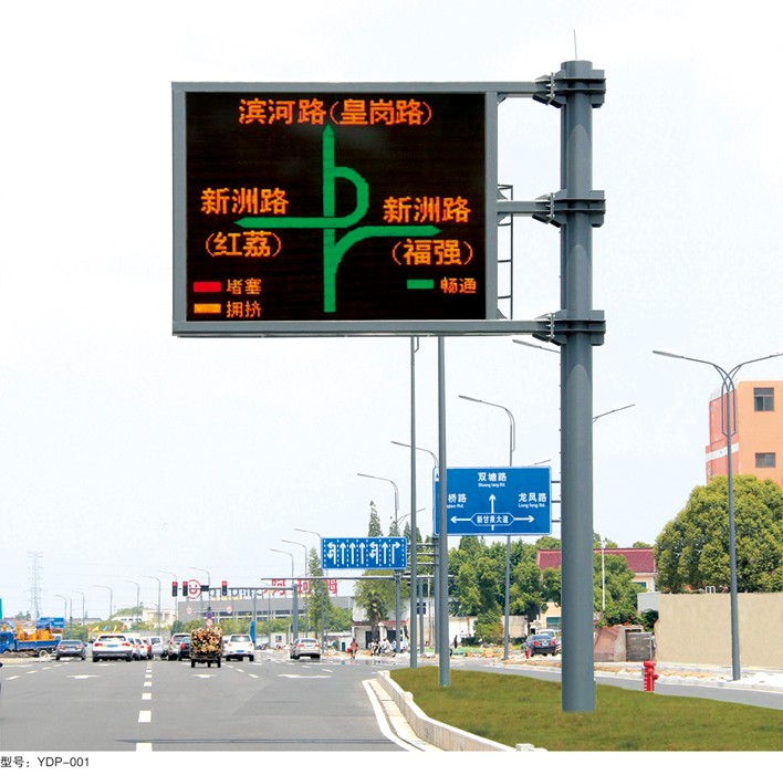 交通誘導(dǎo)屏安裝于城市道路路面上方,為駕駛?cè)藛T提示目前的道路路況信息,交通狀況如:前方施工車禍地點、強風(fēng)、濃霧等警示標語;還可顯示誘 導(dǎo)地圖: (紅:塞車;綠:暢通;黃:擁堵)等,以便駕駛?cè)藛T能更好地掌握目前的路況情況,避免交通堵塞,減少交通事故的發(fā)生。