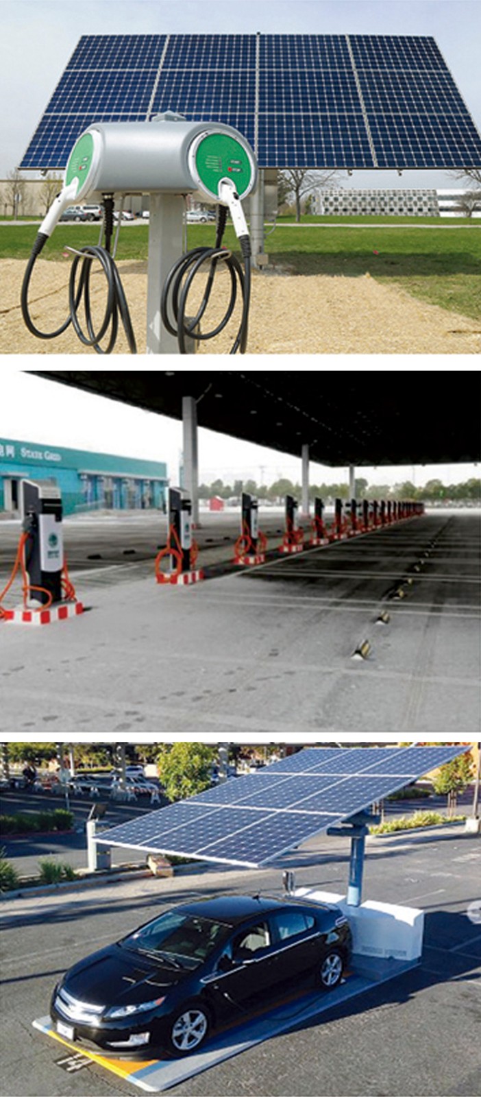 太陽(yáng)能充電站配有太陽(yáng)能光伏發(fā)電系統(tǒng)和蓄電設(shè)備,蓄電設(shè)備主要是蓄電池,太陽(yáng)能發(fā)的電儲(chǔ)存在蓄電設(shè)備中,通過(guò)逆變器輸出交流220V的電壓,并結(jié)合電動(dòng)車充電機(jī)即可完成對(duì)電動(dòng)車的充電。