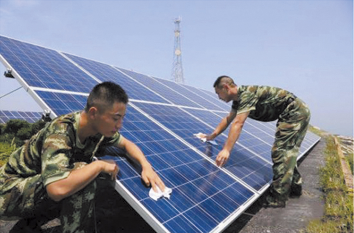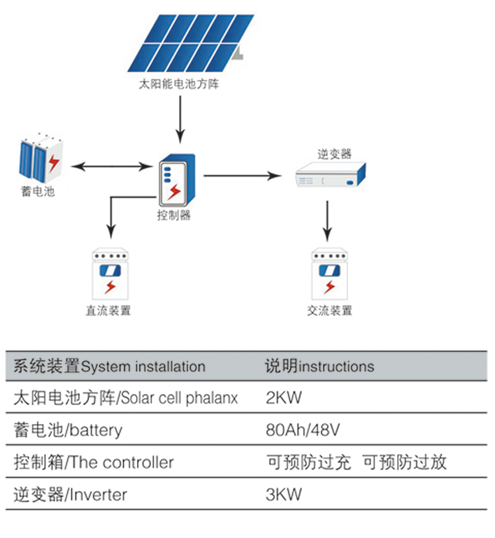 白天通過太陽電池方陣發(fā)的電儲存在蓄電池電池中,滿足軍隊營區(qū)生活照明和辦公設施使用。